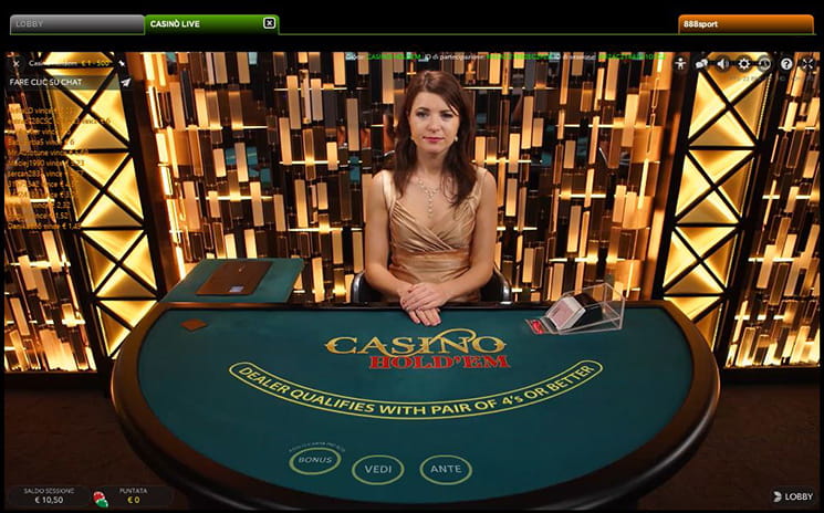 Il casinò live offre un vasto numero di tavoli, e la sua piattaforma è sviluppata da Evolution Gaming, uno dei leader del settore software provider per i giochi di live casinò nel mondo. Per giocare sarà sufficiente effettuare l’accesso al proprio account 888casino e dalla lobby cliccare su “Live Casinò“. Da qui sarà possibile scegliere tra le seguenti categorie: “Roulette”, “Blackjack”, “Hold’em Casino”, “Baccarà”, “Poker a Tre Carte” e “Caribbean Stud”. Tutte le categorie ad eccezione di “Casino Hold’em”, “Poker a Tre Carte” e “Caribbean Stud” offrono diversi tavoli da cui è possibile scegliere, oltre che puntate minime e massime.